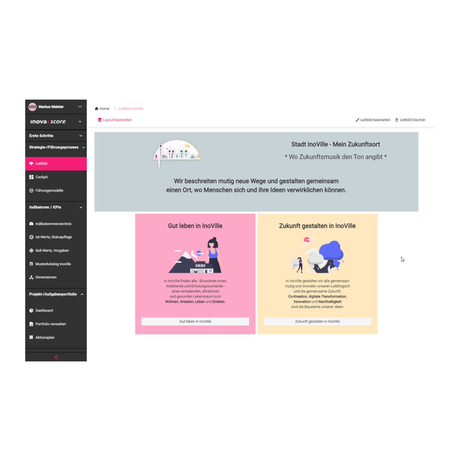Im Release 10.40, liefern wir inova:score mit dem neuen Leitbild Designer aus. Das Leitbild dokumentiert die oberste Ebene der Gemeinde- oder Unternehmensstrategie. Es zeigt der Organisation und allen Stakeholdern den mittel- und langfristigen Weg auf. Häufig werden in dem Zusammenhang Begriffe wie Purpose, Leuchtturm oder Nordstern verwendet. Der Leitbild Designer ist im Rahmen von mehreren Ausbildungsprojekten entstanden. Mit dem Ziel, diese oberste Ebene so attraktiv und informativ wie möglich abzubilden und damit für die Belegschaft greifbar und verständlich zu gestalten.