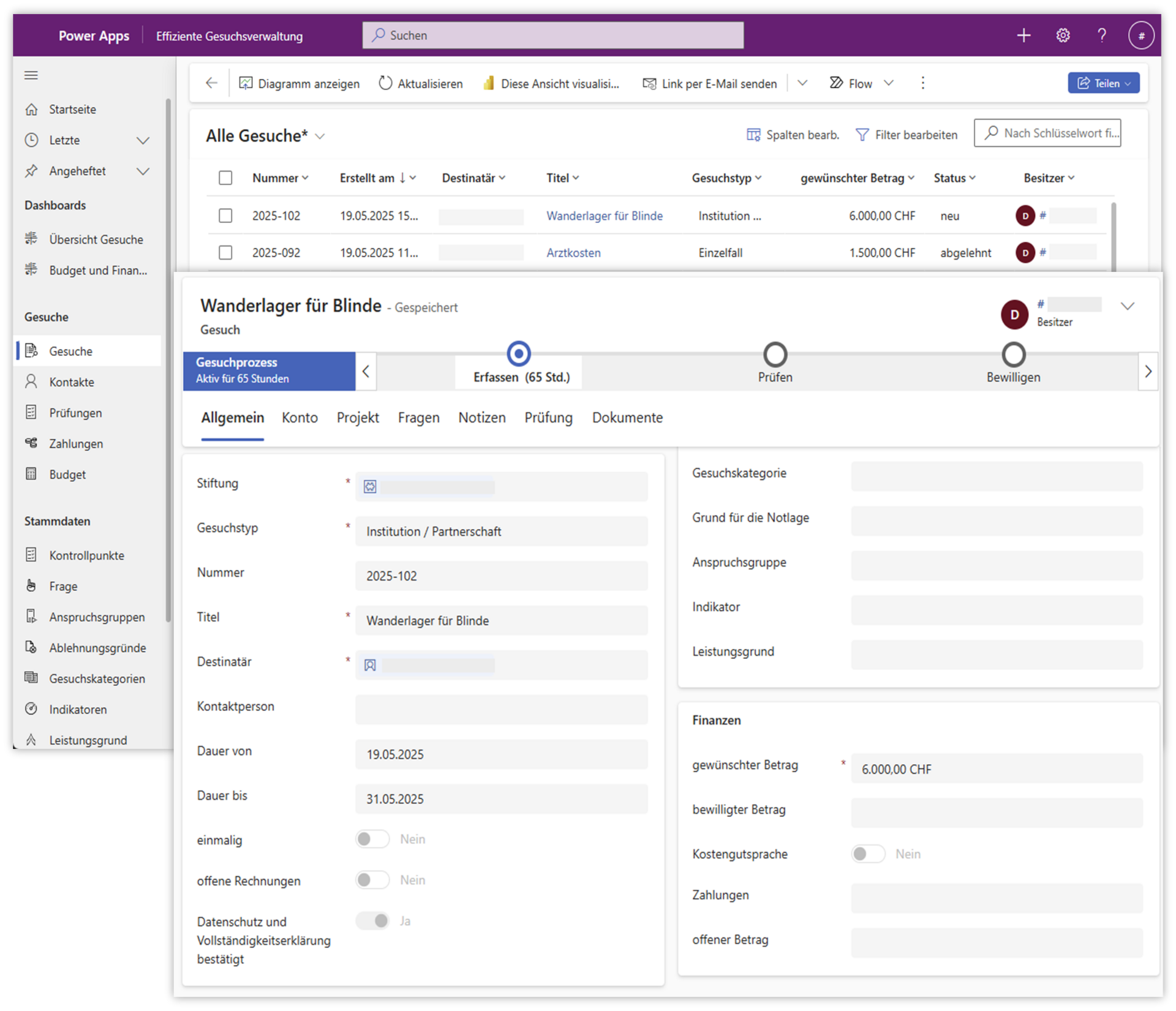 In wenigen Monaten durften wir den gesamten Prozess durch die Entwicklung einer neuen Applikation auf Basis der Microsoft Power Platform modernisieren. Die Gesuche werden nun direkt online gestellt und die Formulardaten werden automatisch in die Applikation übernommen, wodurch manuelle, repetitive Eingaben entfallen. Die neue Lösung ermöglicht eine zentrale, effiziente und prozessbasierte Bewirtschaftung aller Gesuche durch die Mitarbeitenden sowie den Stiftungsrat. Zu den wichtigen Funktionen der Applikation gehören insbesondere: